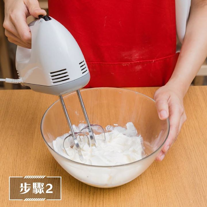 1. 淡忌廉以電動打蛋器打起,放入雪櫃備用。